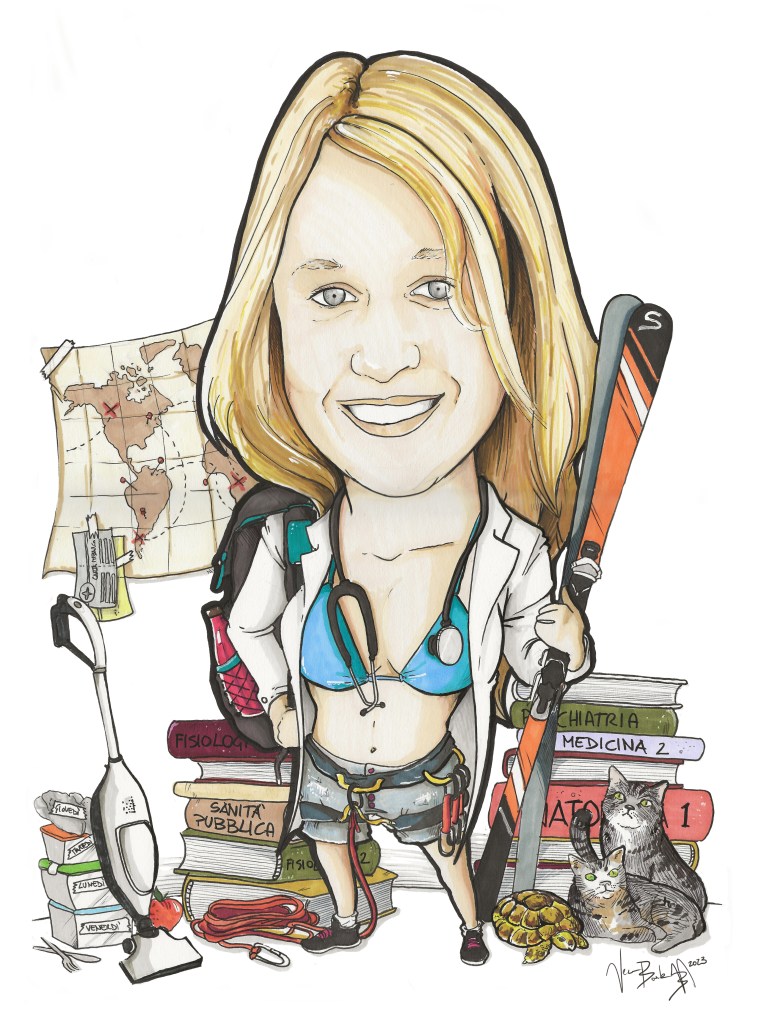 Realizzazione di un disegno a pennarello nero e colori, con ritratto realistico (a richiesta in versione cartoon), accompagnato da elementi caratteristici della persona ritratta. La colorazione può avvenire con pennarelli, matite colorate o in digitale. Adatto per papiri di laurea, regali di compleanno, anniversari o ricorrenze particolari.